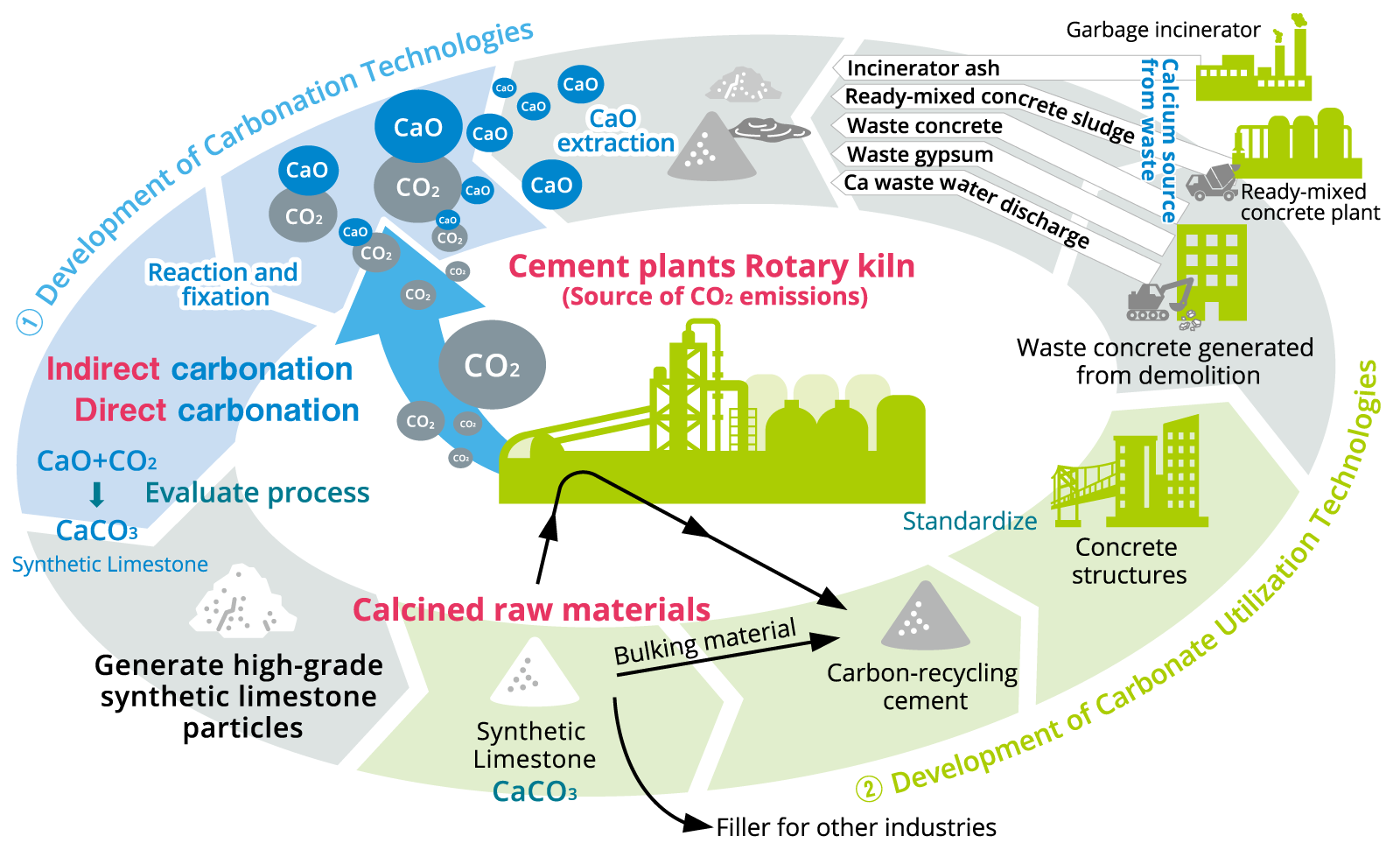 NEDO*1のGI基金*2での採択事業「多様なカルシウム源を用いた炭酸塩化技術の確立」では、下図のように、Ca含有廃棄物からCaOを抽出し、セメント工場の排ガス中CO2と再結合させ、CO2再資源化人工石灰石(CaCO3)を生成するCCUを実現します*3。今後は人工石灰石の量産化に向け、建設産業をはじめ、製紙、樹脂、ゴムなどさまざまな産業での利活用を目指し、原料利用の研究と社会実装に向けた市場評価を開始しています。